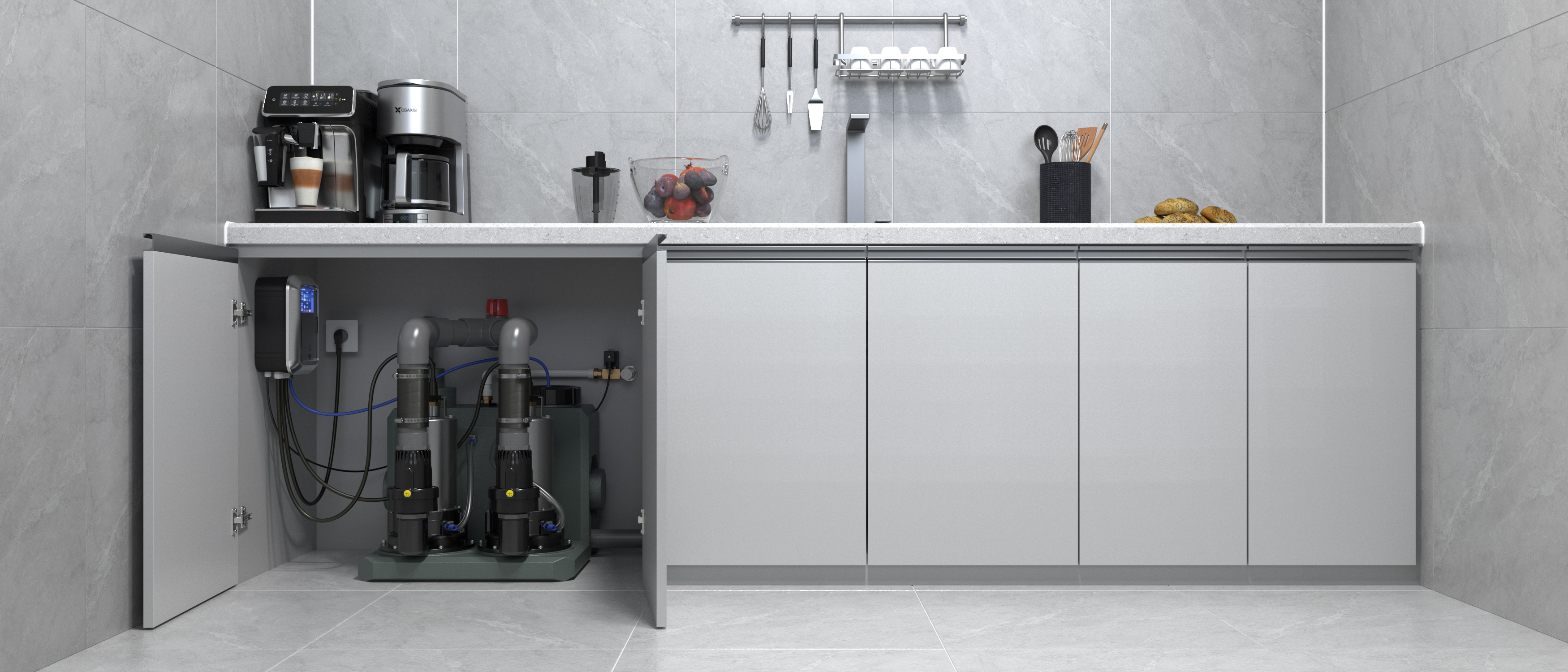 其次是廚房這種帶有油污的排水環境,油污的粘掛性比較強,并且容易堆積影響零部件的正常運行,這時候的智能污水提升器中的反沖洗系統就顯得格外重要,利用自來水管中的清水形成扇形的高壓水,360°沖洗水箱的內壁,高壓水的沖擊力對付這種粘掛的雜物還是很輕松的,我們在手機上設置好清洗的周期后,就不用再管油污的問題了,自動智能自清洗會自動啟動維護的。