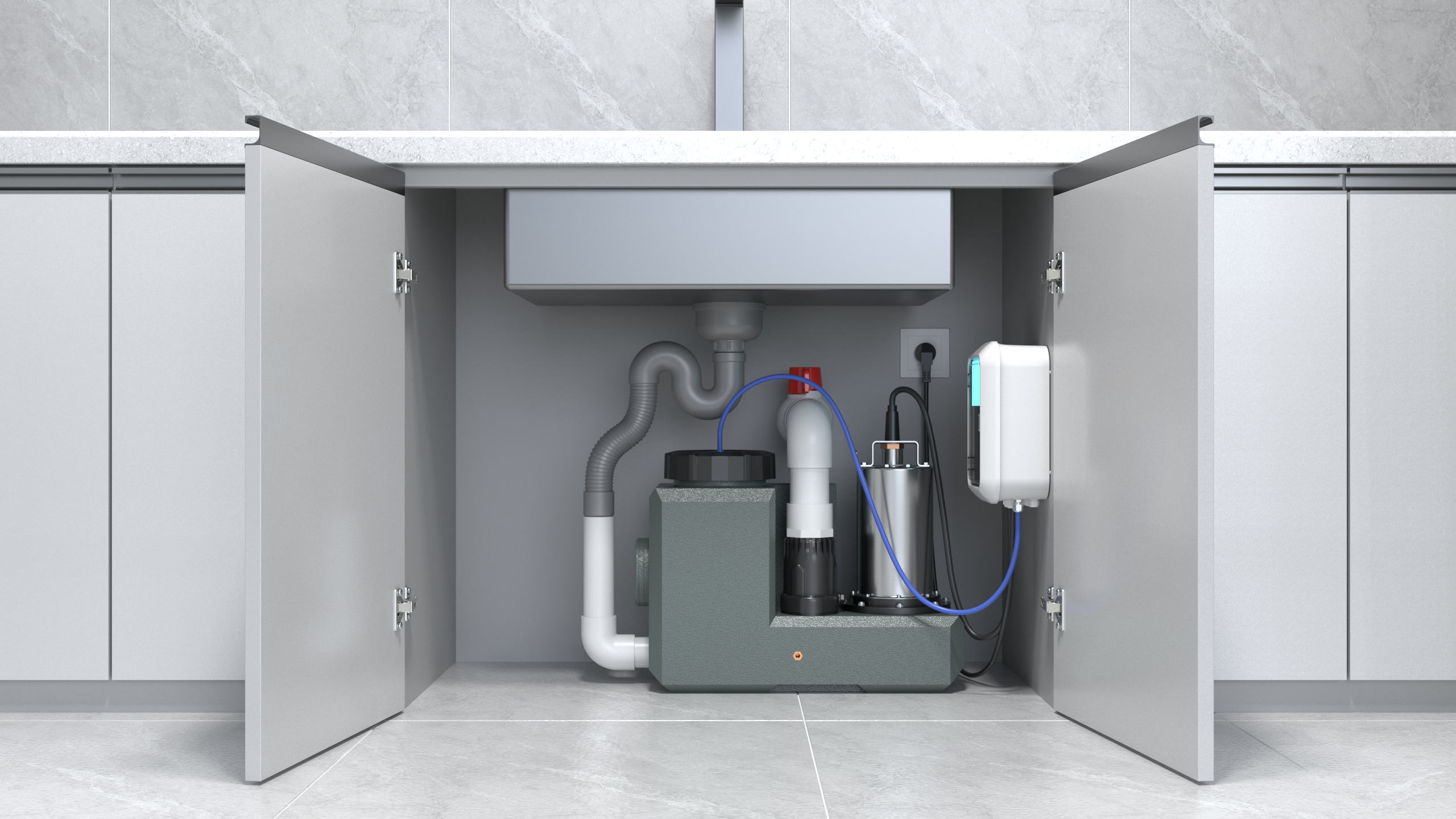 現(xiàn)在我們需要考慮的就是,廚房的排水要怎么解決呢?這可不能像樓上排水的方式一樣做到水往低處流,要改變常規(guī),逆流而上才行,做到水往高處流,而能完成這種改變的就是污水提升器了。