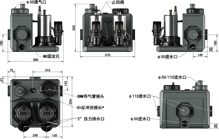 · 入水口:3×φ110,3×φ50,1×φ50/110