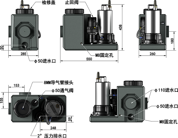 外置粉碎切割泵,業內率先使用油冷式304不銹鋼電機、高壓自來水內部反清洗,滲水和漏水監測、WIFI云端互聯等獨特技術,具有靜音、散熱效果好、運行穩定、能完全浸水等優勢。